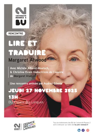 Christine Evain à plaisir de vous inviter à une rencontre organisée par la Bibliothèque Universitaire : « Lire et Traduire – Margaret Atwood », qui se tiendra le jeudi 27 novembre 2025, de 13 à 14h.